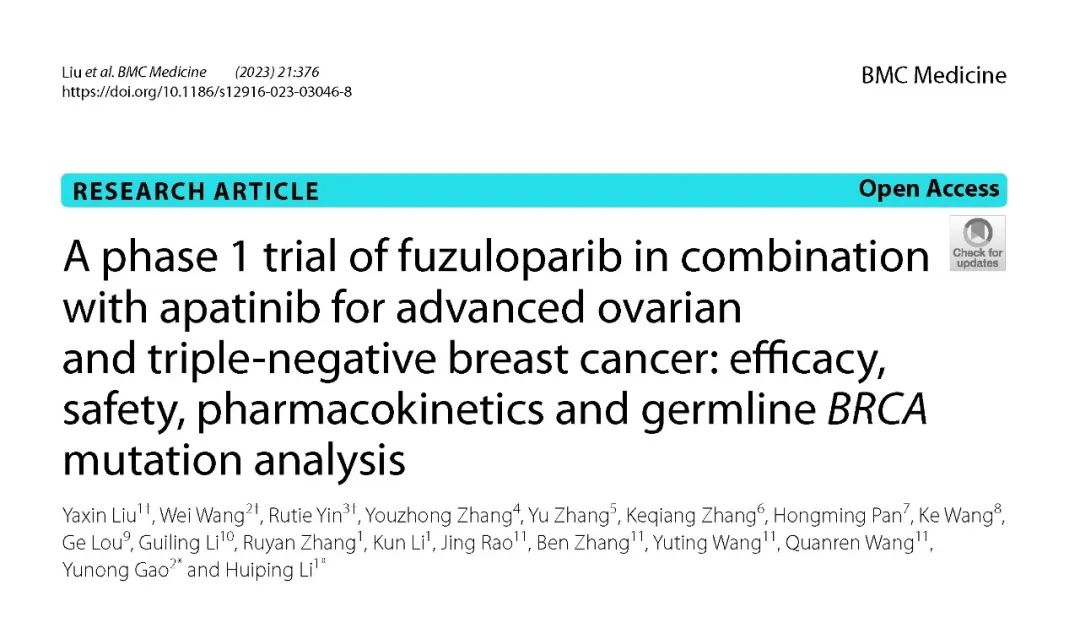 氟唑帕利联合阿帕替尼治疗晚期卵巢癌和三阴性乳腺癌I期研究发表于《BMC medicine》