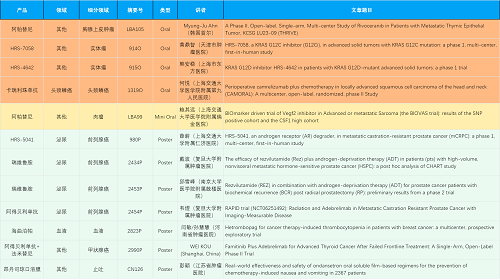 在胸腺上皮肿瘤、头颈鳞癌、肉瘤、前列腺癌、甲状腺癌等其他多个疾病领域,卡瑞利珠单抗、阿帕替尼、瑞维鲁胺、阿得贝利单抗、法米替尼、HRS-7058、HRS-4642、HRS-5041等抗肿瘤创新药相关研究一共入选了4项口头报告、1项简短口头报告、5项壁报,彰显了ag尊龙凯时医药强大的研发实力。此外,海曲泊帕和昂丹司琼口溶膜分别在防治化疗导致的血小板减少和恶心呕吐方面各有1项研究入选壁报。